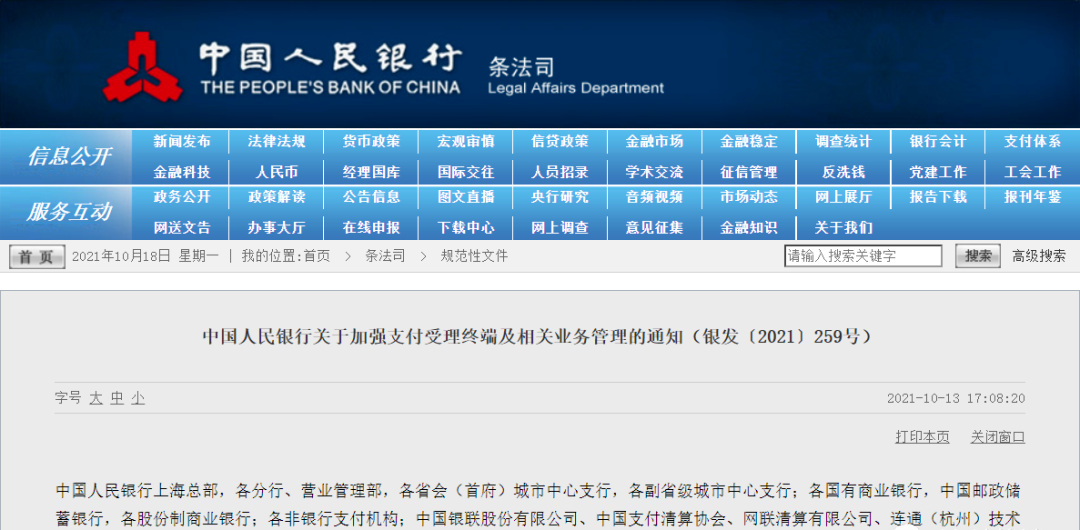 2021年10月13日,中國人民銀行官網(wǎng)發(fā)布《中國人民銀行關(guān)于加強(qiáng)支付受理終端及相關(guān)業(yè)務(wù)管理的通知(銀發(fā)〔2021〕259號(hào))》,對(duì)銀行卡收單和條碼支付終端做出相應(yīng)管理要求。