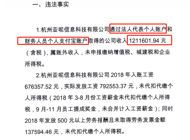 案例一:近日,據(jù)杭稅二稽罰〔2021〕17號(hào)文顯示,杭州某共公司法人代表個(gè)人賬戶和財(cái)務(wù)人員個(gè)人支付寶賬戶取得的公司收入1211601.94元(含稅),屬帳外收入,未申報(bào)繳納增值稅、城建稅和企業(yè)所得稅。被稅務(wù)局稽查!