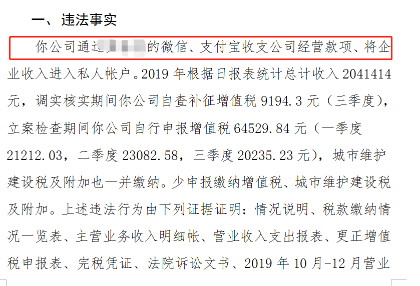 案例三:南京某物業(yè)公司,通過私人的微信、支付寶收支公司經(jīng)營款項(xiàng),將企業(yè)收入進(jìn)入私人賬戶。好在公司通過自查以及立案期間自行申報(bào)進(jìn)行了補(bǔ)稅,才減少了風(fēng)險(xiǎn)和損失。